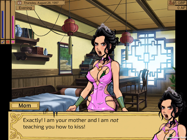 To characterize the mom, she starts out innocent and uptight so her "fall", so to speak, is more pronounced. She's also gullible and well-wishing enough to believe the pretexts the son uses to instigate the sex scenes. She can get angry at the son, because I think players want her to have resistance for them to overcome, but at the end of the day, she's also loving.