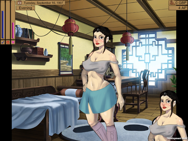 Since the last progress report, there have been many minor changes and a couple of larger ones. The programmatically generated masturbation diary text mentioned in the previous blogpost has had quite a lot of additional work put into it, mostly to add flavor and variety. The code was also refactored to support third-person text, so on schooldays during which random events do not occur, the son will now sometimes daydream sexual thoughts about his classmates, teacher, or mother. The sentences the generator spits out can still be a bit clumsy, but hopefully you'll agree with me that they're all at least somewhat erotic.